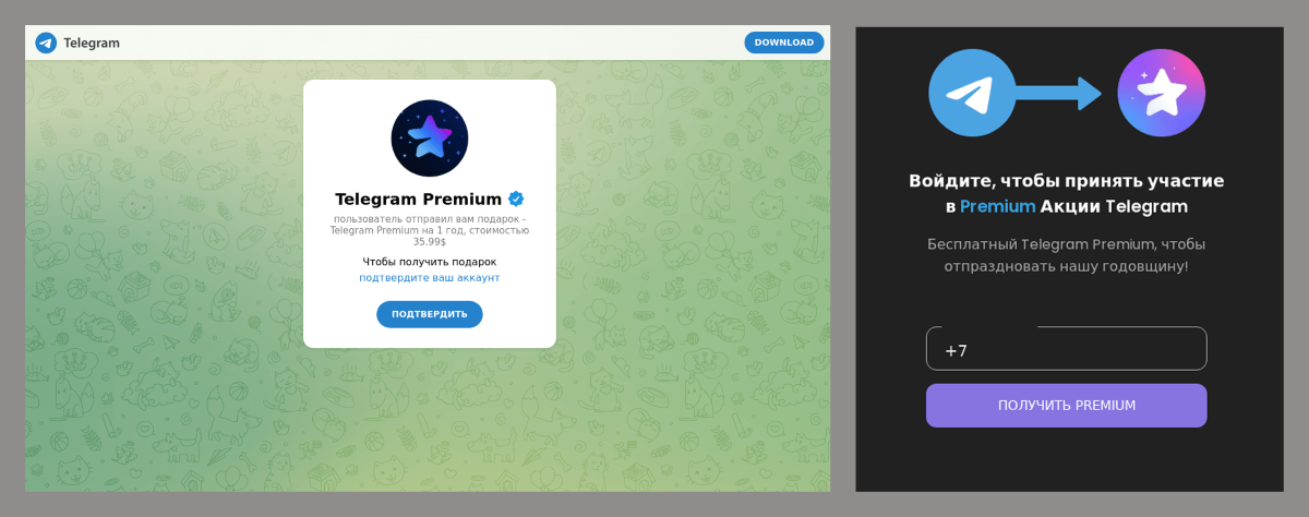 Например, в 2024 году для фишинга использовали клон Telegram. Злоумышленники предлагали скачать «новый клиент» мессенджера, чтобы получить бесплатную премиум-подписку. Источник