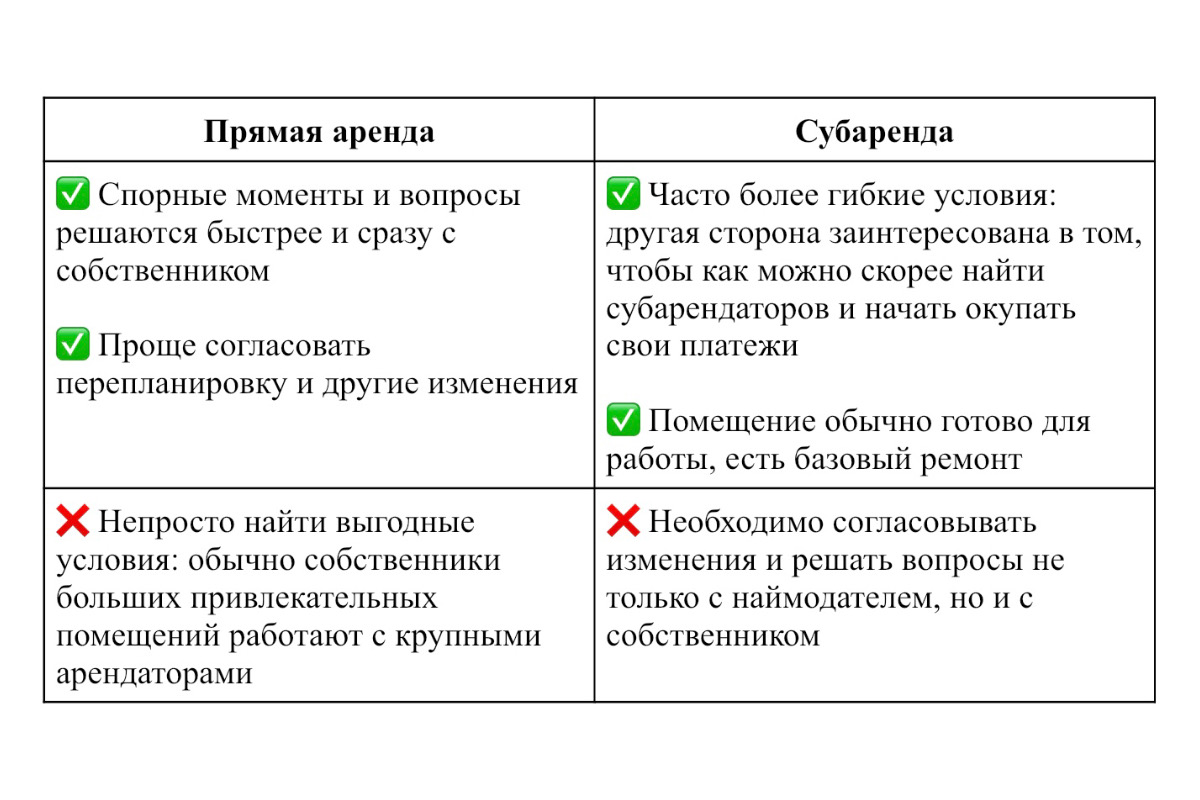 По способу заключения договора. Недвижимость можно арендовать напрямую у её владельца — это прямая аренда. Также встречается субаренда, когда вы заключаете договор с другим наймодателем, который арендовал большое помещение и разделил его на несколько точек, например в торговом центре.