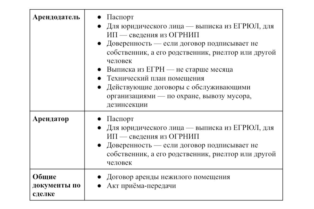 Чтобы заключить сделку, нужны документы от арендатора и арендодателя. Конкретный список зависит от юридического статуса каждой стороны.