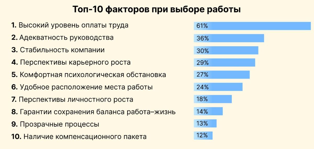 - Стабильность. Надёжность компании — один из трёх факторов, которые мотивируют россиян устроиться на работу. В условиях меняющейся экономический среды людям важно, чтобы в компании они чувствовали себя безопасно.